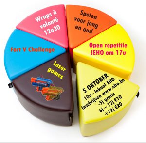 We gaan de fort V challenge aan, eten ons buik vol met wraps en trekken naar het fort om te lasershooten. Maar ook voor de allerkleinsten worden er spelletjes voorzien.